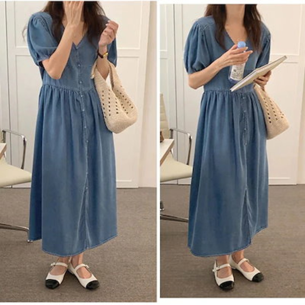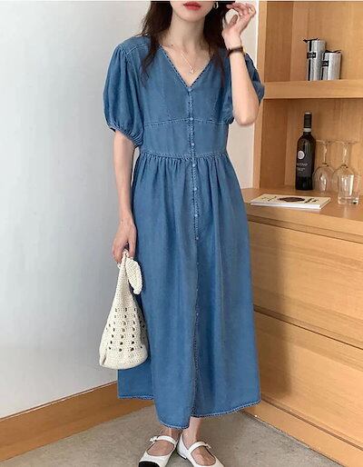 レディース ワンピース デニムワンピース ジーンズワンピース ロングワンピース 大人 春ワンピース きれいめワンピース パフスリーブワンピース 半袖 体型カバー ゆるワンピース 可愛い 着痩せ おし | koookooo
