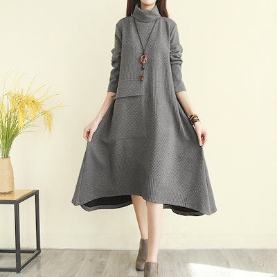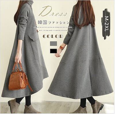 ワンピース レディース 秋冬 ロングワンピース 長袖 チュニック ロングワンピ ミモレ丈 タートルネック ハイネック 無地 マキシワンピース 大きいサイズ 体型カバー ハイネック フレア Aライン 前 | koookooo