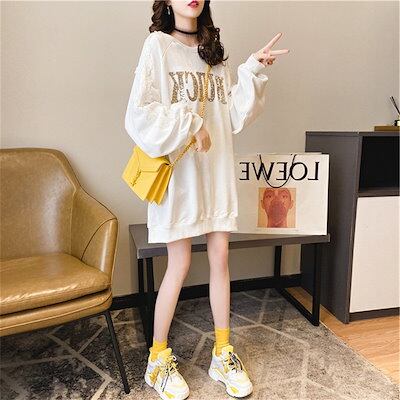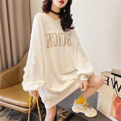 春スウェットインナー薄い長袖 tシャツ レディース レーススパンコール韓国ファッション スウェット セミロング 体型カバー 大きいサイズ トップス パーカー レディース 怠惰な風 | koookooo