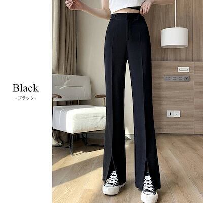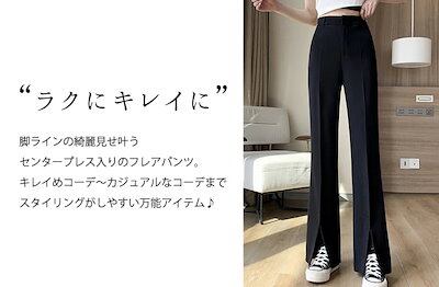 【メガ割 】フレアパンツ レディース スラックス きれいめ ボトムス ズボン 10分丈 薄手 おしゃれ かわいい 白 黒 センタープレス フロントスリット ストレート タック ベルトループ ファスナー | koookooo