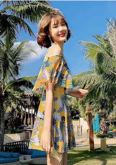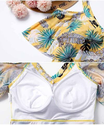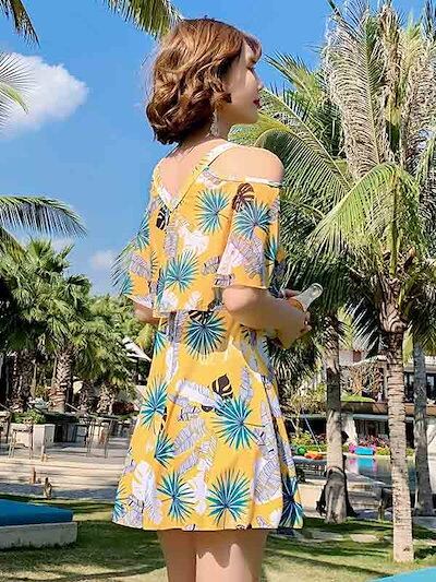 水着 レディース 2点セット 体型カバー ワンピース オープンショルダー 袖あり Vネック ポンチョスリーブ フレア水着 トロピカル柄 露出控え パッド付 大きいサイズ 海 ビーチ リゾート プール | koookooo