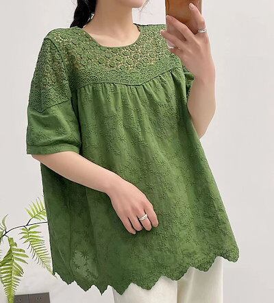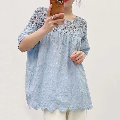 デザイン カットソー レディース 春夏 Tシャツ 綿 トップス 半袖 チュニック ブラウス コットン ロングTシャツ 長袖 ぽわん袖 ゆったり レース 無地 透け感 透かし編み 刺繍 切り替え | koookooo