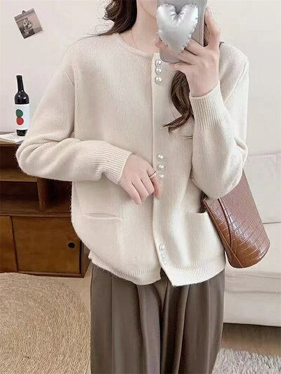 カーディガン ニット レディース アウター 春 秋 冬 羽織り ショートニット トップス 羽織 長袖 ニットカーデ アウター ゆったり ショート丈 無地 シンプル クルーネック 伸縮性 防寒 大人 前 | koookooo