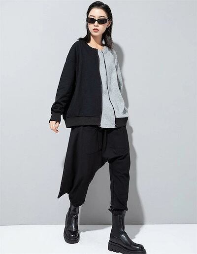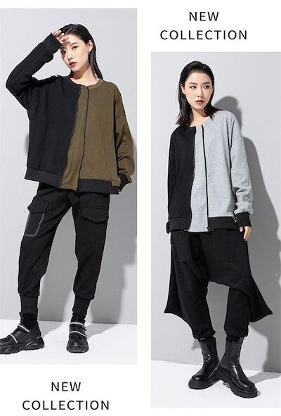 アシンメトリー トレーナー 秋 冬 春 長袖 レディース クルーネック 切り替え スウェット トップス プルオーバー ゆったり 大きいサイズ フロントジップ付き ファスナー 無地 配色 通勤 秋冬 シ | koookooo