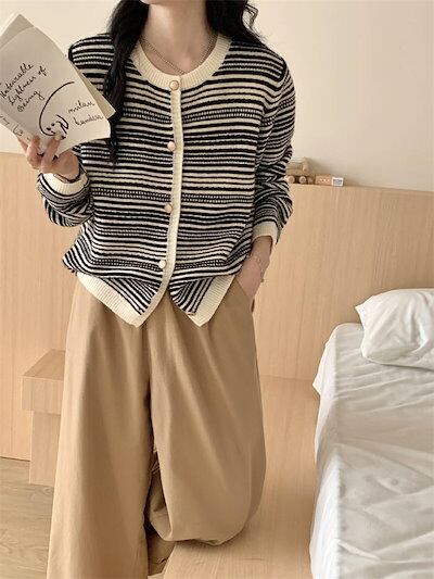 カーディガン レディース 秋冬 ボーダー 春 配色 ゆったり カジュアル おしゃれ 秋 長袖 ニットカーディガン ニット カーディガン トップス ニット シャツブラウス ジャケット 体型カバー 重ね着 | koookooo