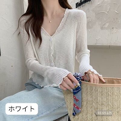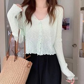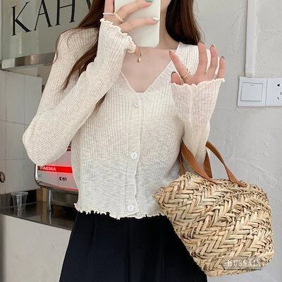 2024 夏 韓国 ライトニット カーディガン トップス 羽織り加工 ショート 薄手 長袖 紫外線対策 UV対策 きれいめ オフィス OLネックカジュアルフレンチフェミニンファッション韓国 レディース | koookooo