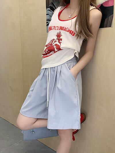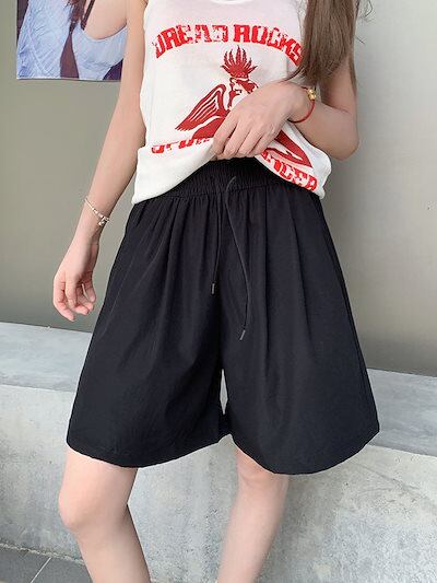 2024 春夏パンツ ハーフパンツ ワイド ストレート ウエストゴム ハイウエスト 美脚効果 脚長効果 細見え 夏 水色 黒 白 おしゃれ かわいい 韓国ファッション レディース お出かけ | koookooo