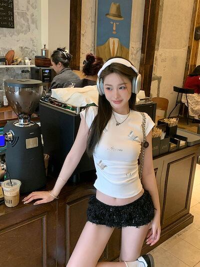 2024 夏 韓国トップス プリント半袖 Tシャツ 韓国 ラウンドネック スリム かわいいへそ出し 白ショート おしゃれスリーブ カジュアルセットアップコーデ丈 ファッションレディースフレンチお出かけ | koookooo