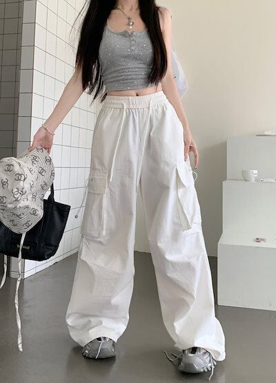 2024春夏パンツ ロング丈 ポケット ワイド ストレート ウエストゴム ハイウエスト 美脚効果 脚長効果 細見え 夏 白 黒 おしゃれ かわいい 韓国ファッション レディース お出かけ | koookooo