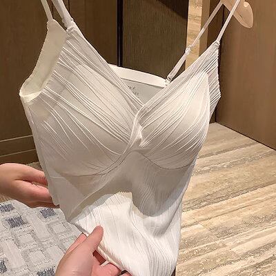 カップ付きインナー 2024 春夏 新作夏の準備!ノースリーブフレンチギャザーvネックタンクトップでセクシーキャミソールを外着可能 レディース 韓国ファッション