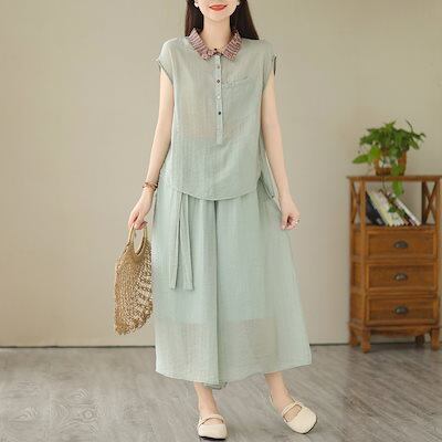 夏 新作 おしゃれ カジュアル 気質 セットアップ ノースリーブ Tシャツ 切り替え ワイドパンツ 大きいサイズ 二点セット ゆったり 百掛け 高級感 涼しく楽ちんセットアップ 2025福袋 | koookooo