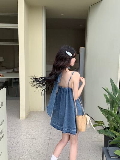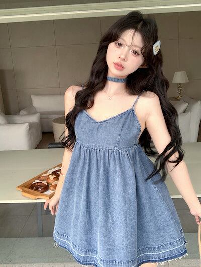 2024春夏ワンピース ミニ丈 デニム生地 ゆったり ノースリーブ キャミソール Aライン ハイウエスト かわいい カジュアル おしゃれ 夏 韓国ファッション レディース お出かけ | koookooo