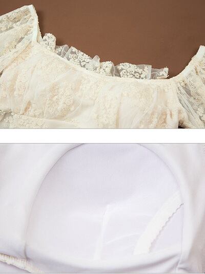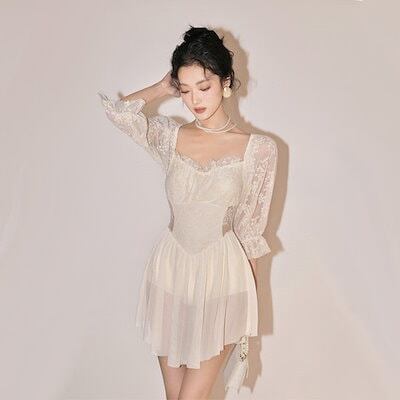 水着 ワンピース レディース 体型カバー 黒スクエアネック オールインワン 長袖 パフ袖 フリル レース レースアップリボン 編み上げ パッド入り 着痩せ 盛れる 透け感 おしゃれ フェミニン 上品 | koookooo