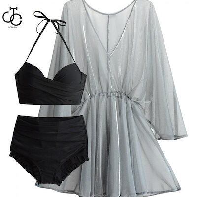 水着 レディース 体型カバー フリル ブルー 可愛水着 シアートップス+フリルデザインハイウエスト水着3点セット