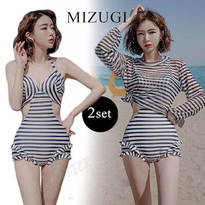 水着 高校生 体型カバー 2点セット レディース 長袖 ビキニ 韓国 大人 ラッシュガード 可愛い フリル 小胸 セクシー タンキニ 露出控えめ ショートパンツ 縞柄