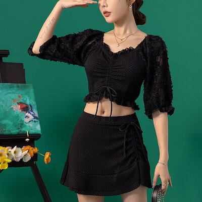 水着 レディース 無地 レース フリル 2点セット ベージュ ブラック ホワイト 保守 スイート 体型カバー オトナ女子 お腹 露出控えめ 水着 小胸 盛れる 水着 セクシー カバーアップ 韓国 | koookooo