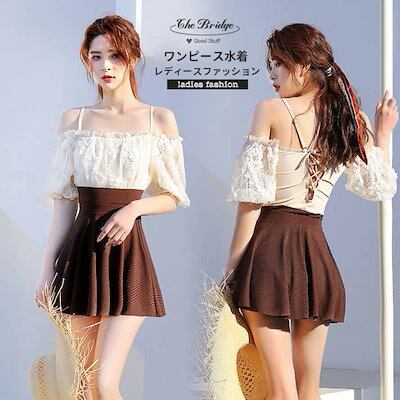 水着 ワンピース レディース 可愛い オールインワン スカート セクシー コーヒー レース フリル 小胸 パッド付き 体型カバー フレアスカート 露出控えめ 保守水着 温泉水着 ママ水着 20代 30 | koookooo