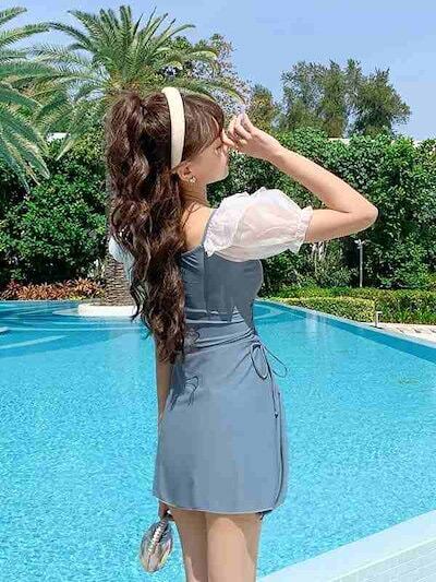 【新品】ワンピース水着 服みたいな レディース 2点セット リボン フリル 半袖 ワイヤーなし パッド付 着せ シンプル セクシー 写真映え 撮影用 海 夏 サマー プール リゾート かわいい 旅行 | koookooo