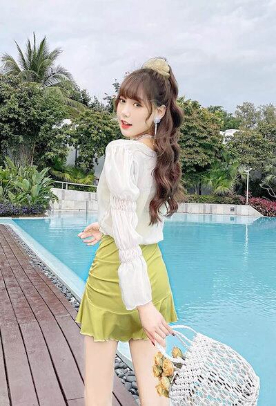 ワンピース水着 服みたいな 水着 レディース 2点セット 長袖 フリル 透け感あり 無地 着?せ 体型カバー ぽっちゃり シンプル セクシー 写真映え 撮影用 海 夏 サマー プール リゾート かわい | koookooo