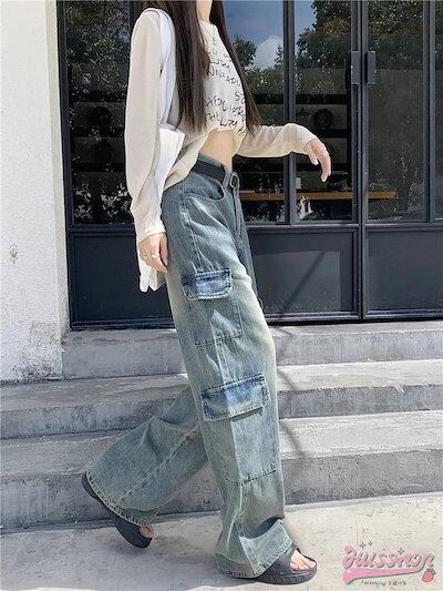 2025 春夏パンツ モップパンツ デニム ジーンズ ワイド ストレート ポケット ハイウエスト 脚長効果 美脚効果 細見え ウォッシュ加工 春 水色 カジュアル 韓国ファッション レディース お出か | koookooo