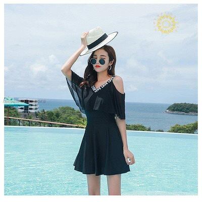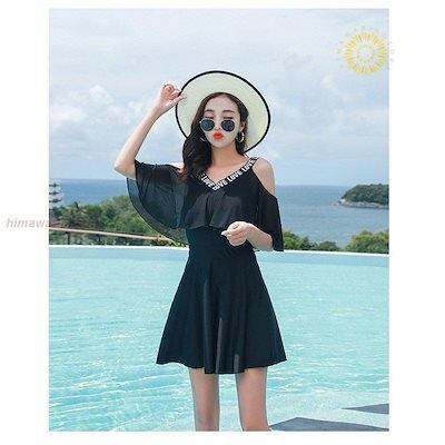 水着レディース 体型カバー 水着 ワンピース型 セパレート 肩出し 小胸バンドゥ 水着2点セット 黒 フリル 韓国風 40代 大きいサイズ 可愛い ウェア 温泉 ママ