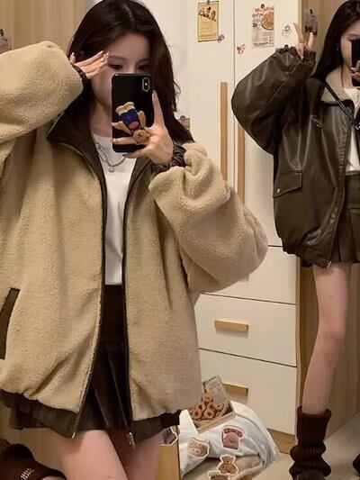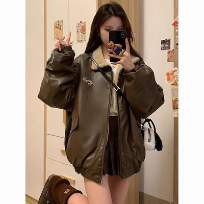 秋冬防寒 あったか 中綿 レザーアウター 韓国風スタイルアップ かわいい ブルゾンファー付きファッション系裹起毛大人ゆったりカジュアルストリートサイズレディースムートン襟フリースシルエット学生通学丈 | koookooo