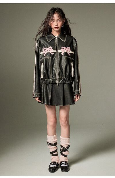 2024 秋冬 甘くてかっこいい 長袖 韓国ジャケット かわいい ショート アウター ブラック 羽織り春レディースレトロ合成 バイカラーカジュアル 女っぽ きれいめ ファッション 色っぽ 大人フェイク | koookooo