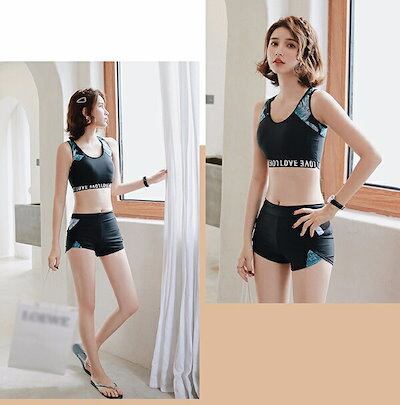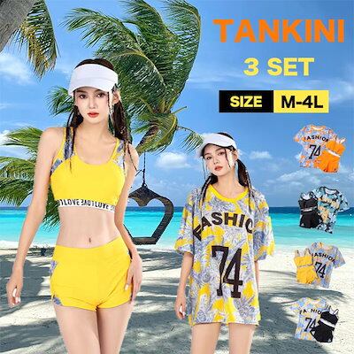 3点セット 小胸 体型カバー 水着 タンキニ セパレート 大きいサイズ レディース 着痩せ 袖付き パッド付 お尻 お腹カバー オトナ女子 ショートパンツ 20代 30代 旅行 海 韓国風 大人 女性 | koookooo