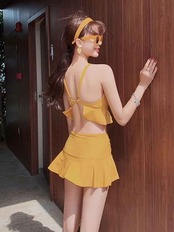 水着 レディース タンキニ 体型カバー 大きいサイズ イエロー 半袖 見せパン かわいい ぽっちゃり 女性 5L 海水浴 韓国風 黄色 お腹カバー お尻カバー 二の腕カバー おしゃれ 露出控えめ | koookooo