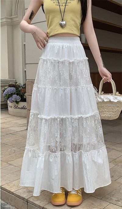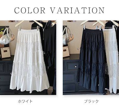 フレアスカート レディース 春 夏 スカート ロング丈 切り替え レース 刺繍 ウエストゴム ボトムス 異素材 ロングスカート 透け感 裏地付き マキシ丈 薄手 ふんわり ボリューム セレモニ | koookooo