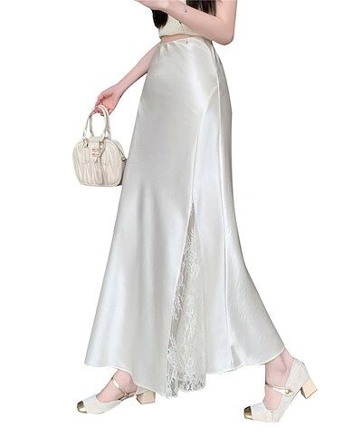 マーメイド レディース レース サテンスカート タイトスカート aライン ハイウエスト マキシ丈 光沢感 着?せ 異素材 透かし編み 春夏秋