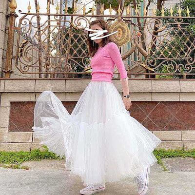 スカート レディース チュールスカート マキシ丈 ロングスカート フレアスカートプリーツスカート Aライン ふんわり ボリューム ボトムス ギャザー 体型カバー 無地 ウエストゴム オールシーズン 大 | koookooo