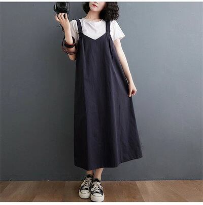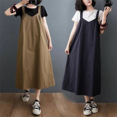 ジャンパースカート 夏 レディース ロングワンピース サロペットスカート ジャンスカ 大きいサイズ ゆったり ポケット ナチュラル 無地 春夏秋冬 ゆったり 体型カバー レイヤード 重ね着 着?せ 大 | koookooo