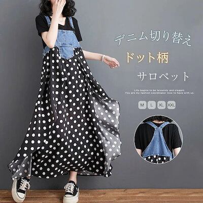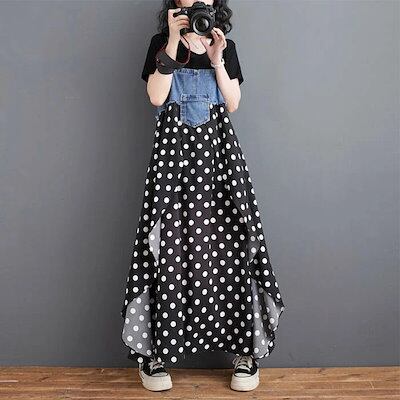 ジャンパースカート 夏 レディース サロペット スカート ドット柄 水玉 デニム切替 シフォン ジャンスカ キャミワンピース ロング丈 フレア ワンピ ゆったり カジュアル 体型カバー 大きいサイズ | koookooo