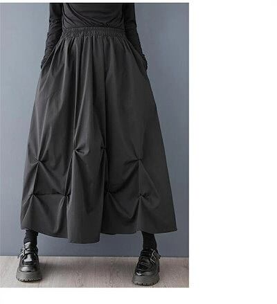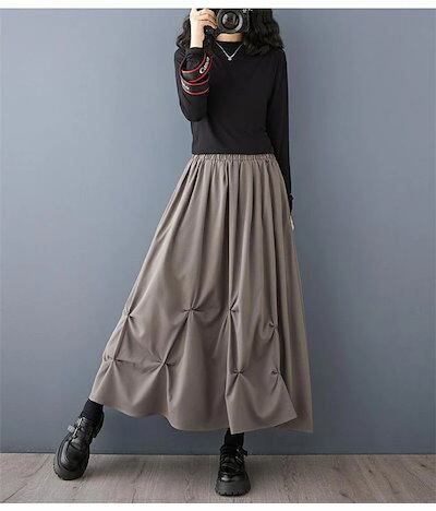 スカート ギャザーデザイン バルーンスカート レディース ロングスカート ミモレ丈 ボトムス フレアスカート ハイウエスト Aライン ゆったり ウエストゴム カジュアル 大人可愛い ブラック 黒 体 | koookooo