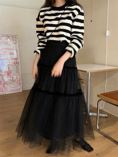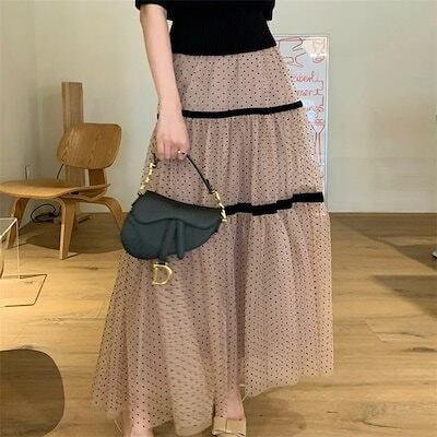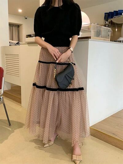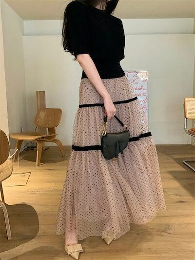 チュールスカート 夏 レディース ドット 水玉 フレアスカート 春夏 ロングスカート チュールスカート ボトムス キレイめ 体型カバー ウエストゴム Aライン お洒落 ゆったり エレガント フェミニン | koookooo