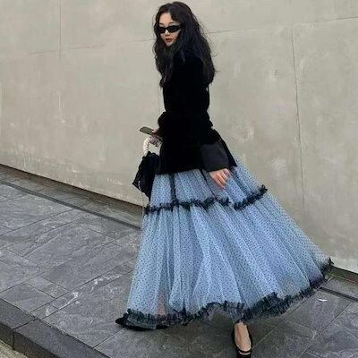 チュールスカート スカート レディース 夏 春 ボトムス マキシ ロングスカート フレアスカート ウエストゴム 水玉 マキシ丈 ドット柄 スカート フリル ボリューム ゆったり 動きやすい 秋 冬 体 | koookooo