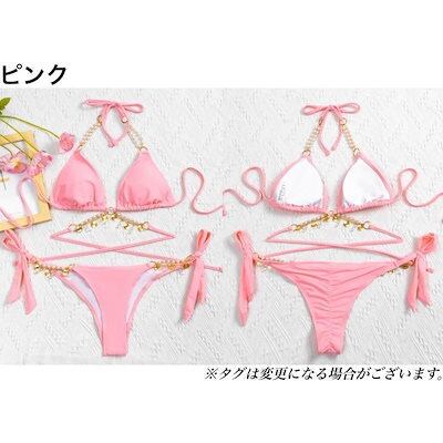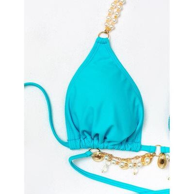 三角ビキニ 水着 レディース ノンワイヤー ホルターネック パッド 取り外し可能 フェイクパール チェーン パール調 無地 シンプル 海 ビーチ リゾ