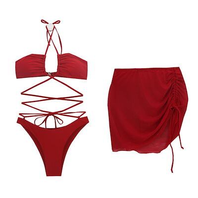 ビキニセクシーバックレスファッションストラップ付き大きい胸プッシュアップスプリットスカート三角水着レディース3点セット