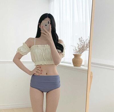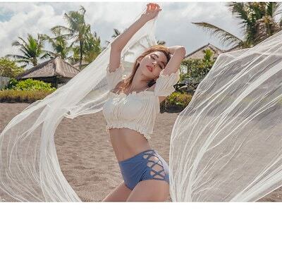 る 水着 ビキニ レディース タンキニ 紐 体型カバー 三角ビキニ セパレート パッド付き 二の腕カバー フリルショルダー パフスリーブ レースアップ バックシャン ハイウエスト セット | koookooo