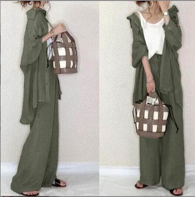 2点セット セットアップ レディース 春夏 長袖シャツ ガウチョパンツ 着痩せ 体型カバー 通勤オシャレセットアップ