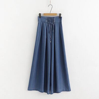 天糸デニムスカンツ薄手プリーツスカートスカーチョ ガウチョパンツ ガウチョ ワイドパンツ レディース デニムパンツウエストゴム シンプル きれいめ /ゆったり天糸デニム広い足のズボンはぶら下が スラッ | koookooo