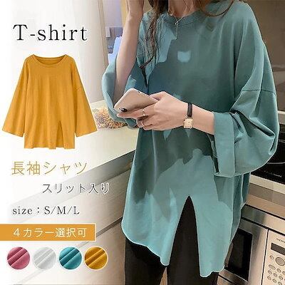 Tシャツブラウス/長袖Tシャツカットソー トップス 長袖 ロンT ロング丈 レディース無地 ロング