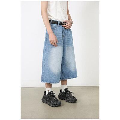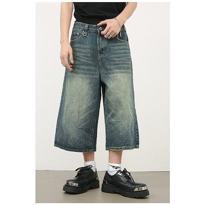 ジーパン ゆったり レディース メンズ ジーンズ デニムパンツ B系 無地 太め 大きいサイズ お兄系 ストレート 七分丈 アンクルパンツ ワイドパンツ シンプル