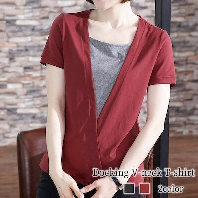 Tシャツ レディース ドッキングVネックTシャツ コーデ ブラウス ブランド ロング 薄手 半袖 かわいい 涼しい 大人 ブラック カジュアル ティーシャツ Vネック 7分袖 トレーナー 無地 人気 | koookooo