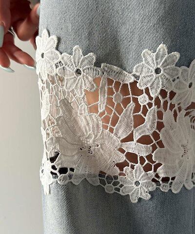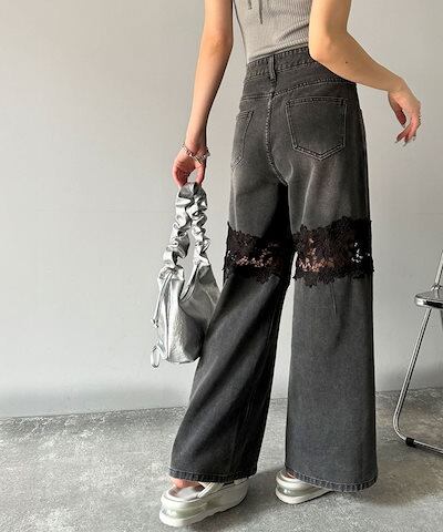 Classical Elfmilybilet ボトムス パンツ レディース デニムパンツ 花柄レース ワイドパンツ ストレート ワイドデニムパンツ リラックス感 カジュアル ゆったり リメイク仕様 ガーリー モチーフレース 大 | koookooo
