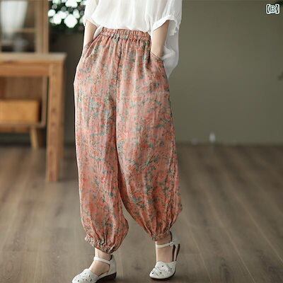 パンツ レディース 夏 綿麻 ハーレム ズボン キャロット ワイド ウエストゴム 柔らかい 大きいサイズ 薄手 スリム 冷感 シンプル カジュアル カーキ オレンジ 緑 小花柄