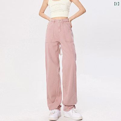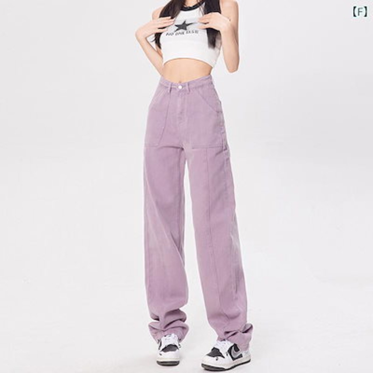 ボトムス レディース ハイウエスト パンツ ストレッチ デニム ロング アメリカ風 大きな ポケット ワイドレッグ 夏 薄手 コットン ピンク 紫