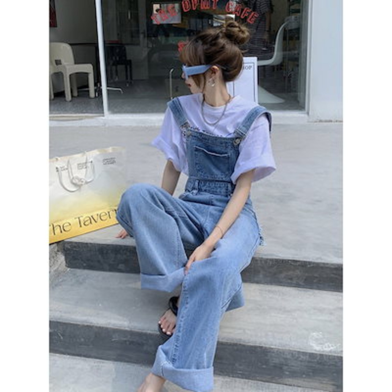 2025春服 韓国 減齢 ズボンのすそに穴が開いたカウボーイストラップモップ 長ズボン 女 コーデ完成 サロペット ワイドパンツ 韓国ファッション デニム