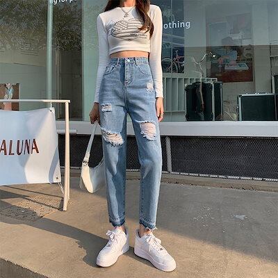 2024春夏 新作 おしゃれ 破れ穴 ゆったり ハイウエスト デニムパンツ 着痩せ カジュアル 九分丈パンツ 百掛けスラックスパンツ 韓国ファッション スキニーパンツ 脚長効果! ひんやりボトムス | koookooo